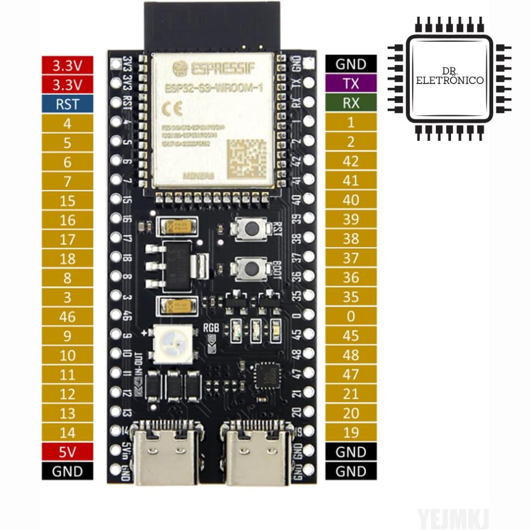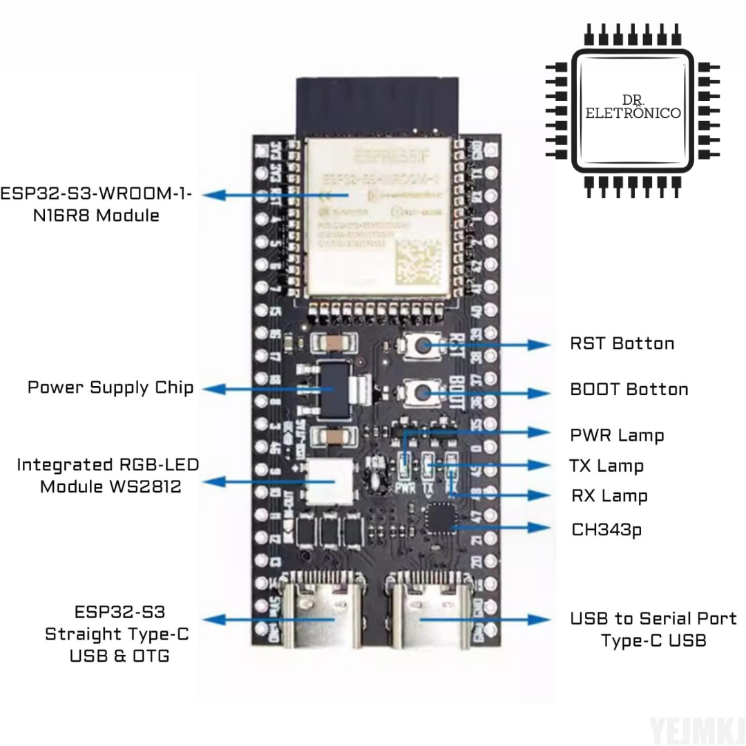 | Periféricos | SPI, I2S, I2C, PWM, RMT, ADC, UART, USB Serial/JTAG e Touch |