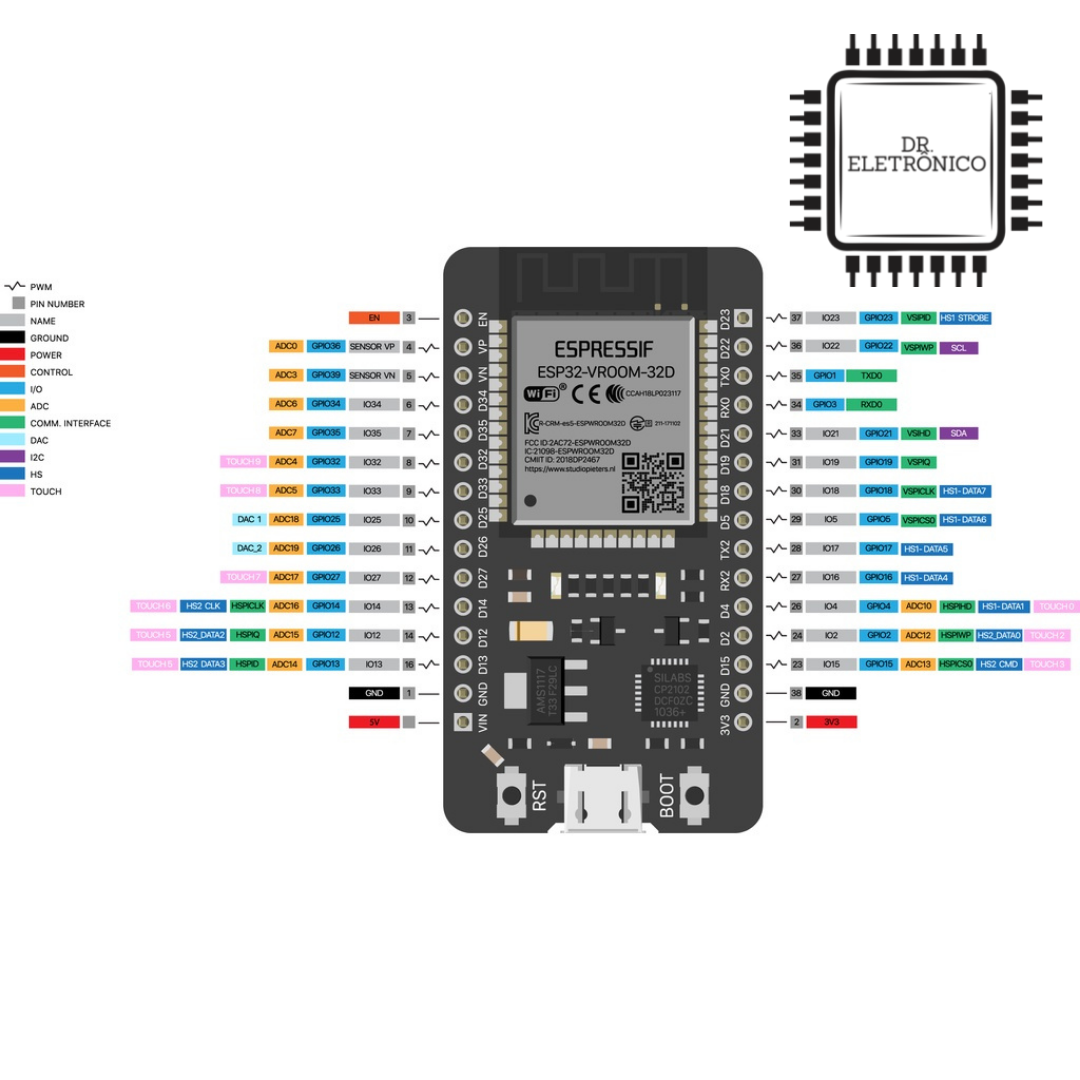 GPIO com funções de PWM, I2C, SPI, etc
